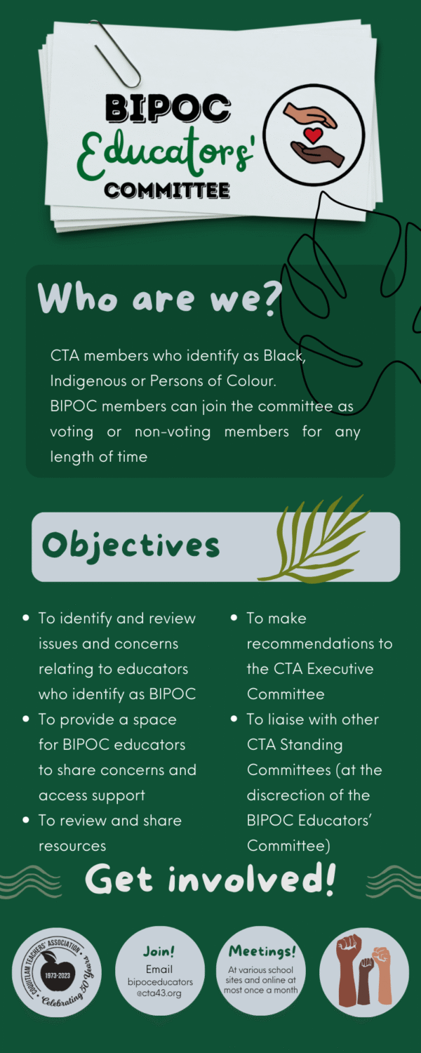 Thank you for an amazing year! Meetings will start up again in the new year. Check back in September for details! The CTA BIPOC Educators’ Committee is for any Coquitlam teacher who identifies as Black, Indigenous, or a Person of Colour. BIPOC teachers can join our email list without regularly attending meetings or joining the committee. To join us or ask any questions you might have, contact Ryan Cho at bipoceducators@cta43.org We hope to see you soon!